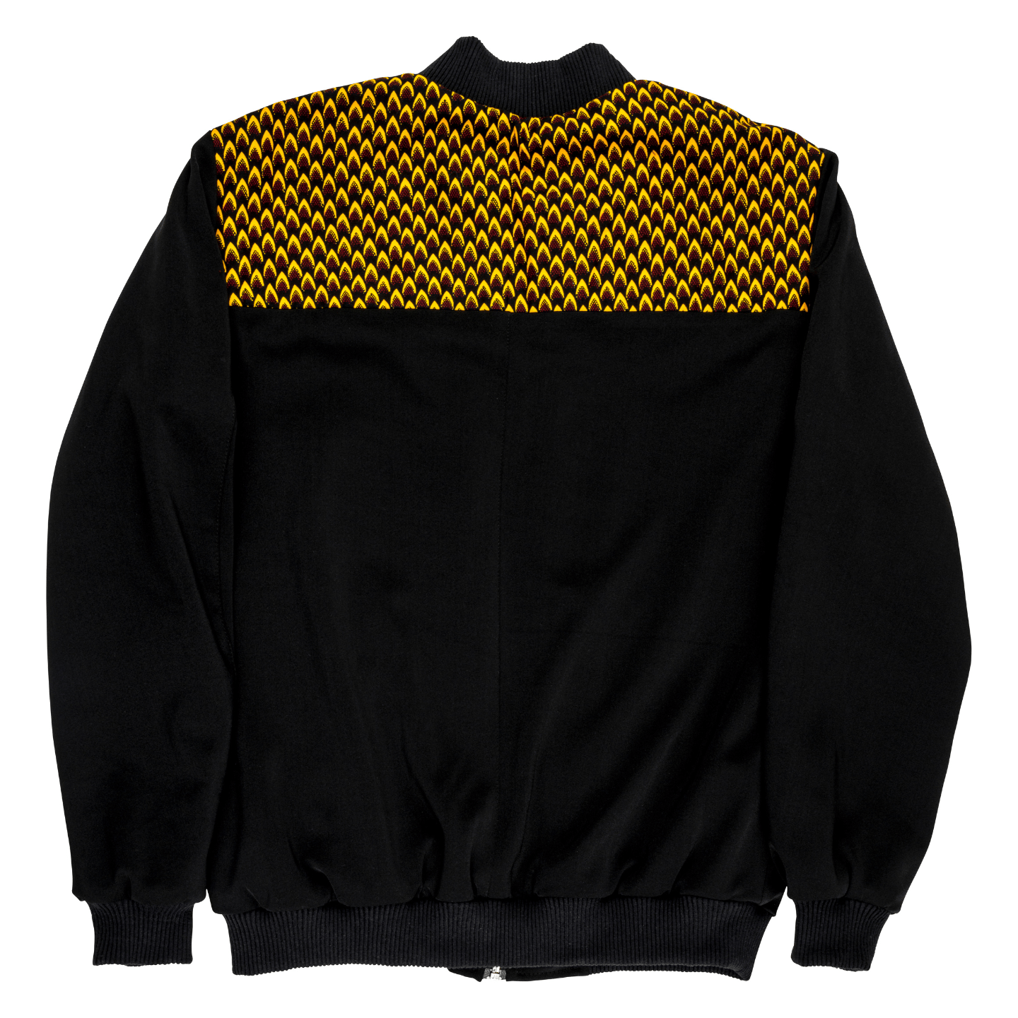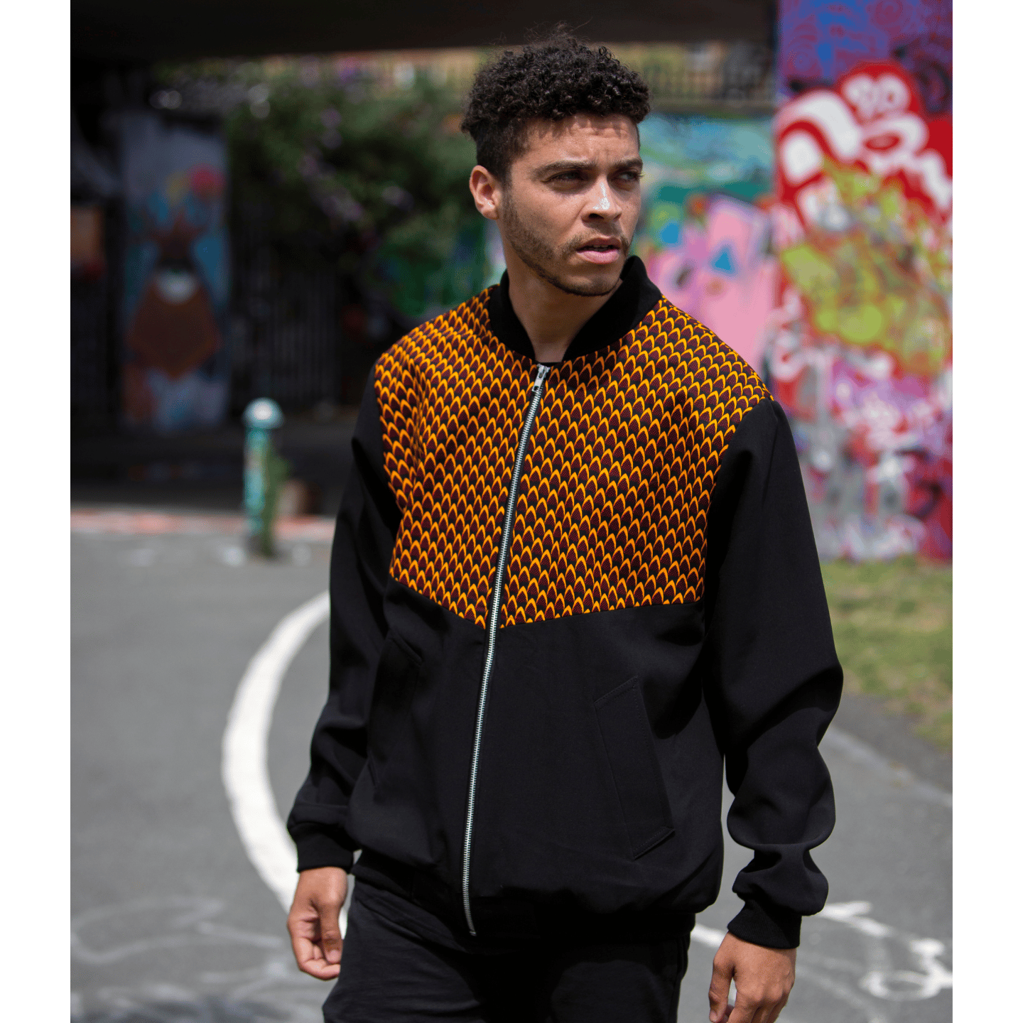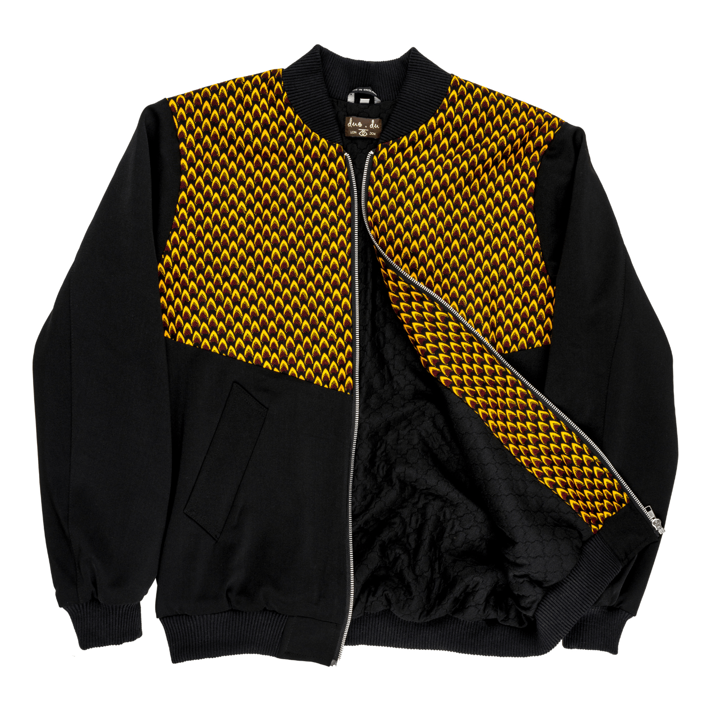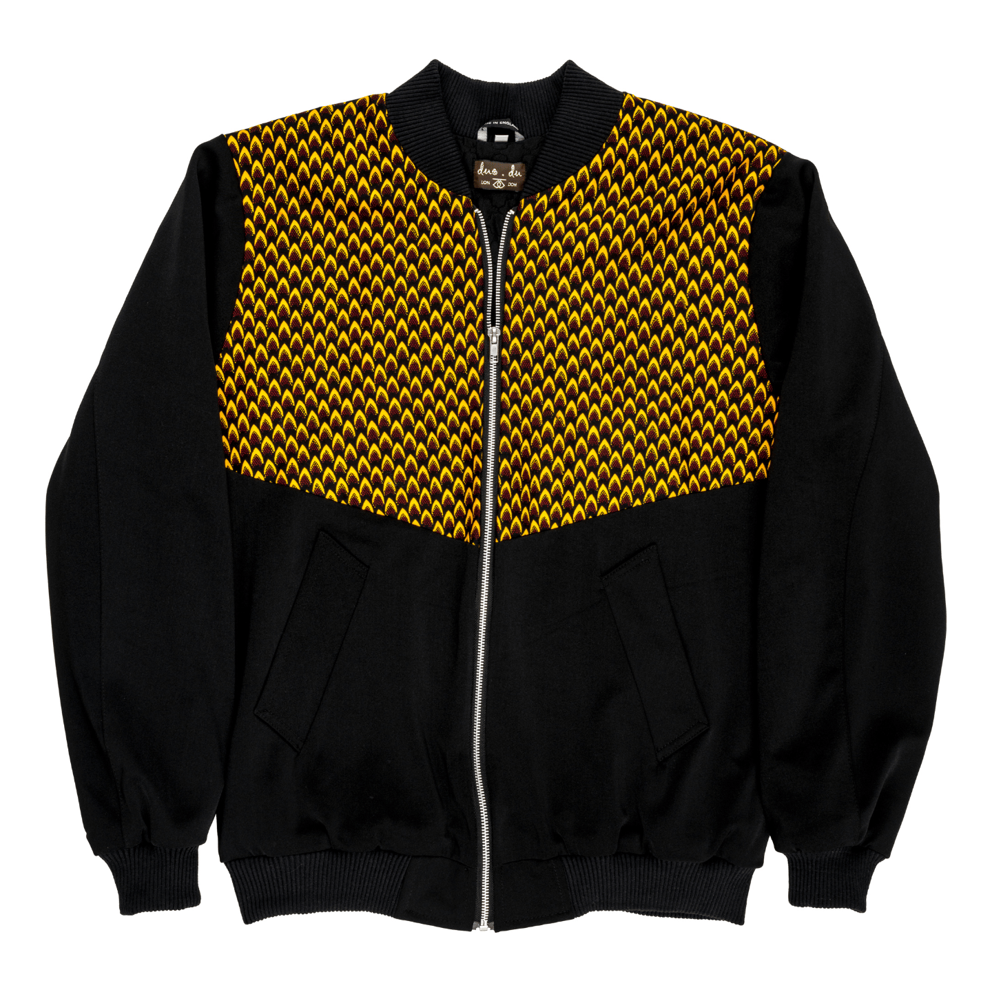 The African Print Bomber Takra proudly displays this print on the front panel.